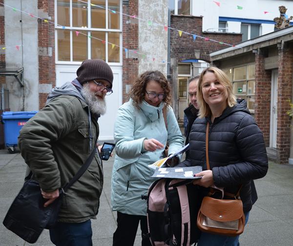 Après une courte pause, les participant·es reçoivent les consignes d’un jeu de piste historique et géographique, imaginé par Sophie Van Cutsem, Maurane Detré et Ozan Özen, professeurs de Sciences Humaines de la HEFF, et leurs étudiants. Grâce à ce dispositif ludique et d’une grande richesse pédagogique, les joueurs et joueuses parcourent les rues entre la Tour à Plomb et la Place Rouppe, découvrant au fil du trajet les traces matérielles et symboliques de 150 ans d’innovation éducative et d’évolution urbaine bruxelloise.
